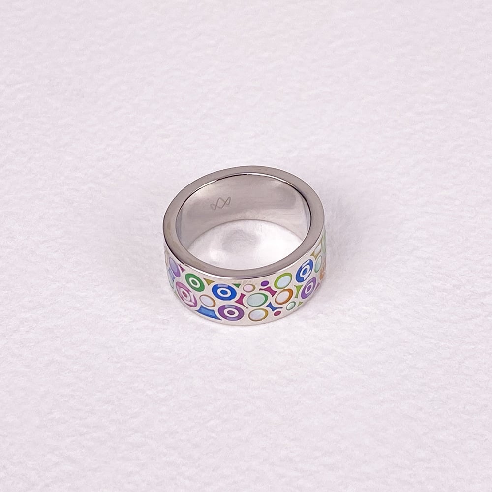 Stainless steel ring decorated with mother of pearl mosaic and bright enamels